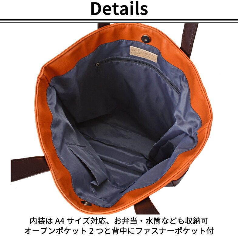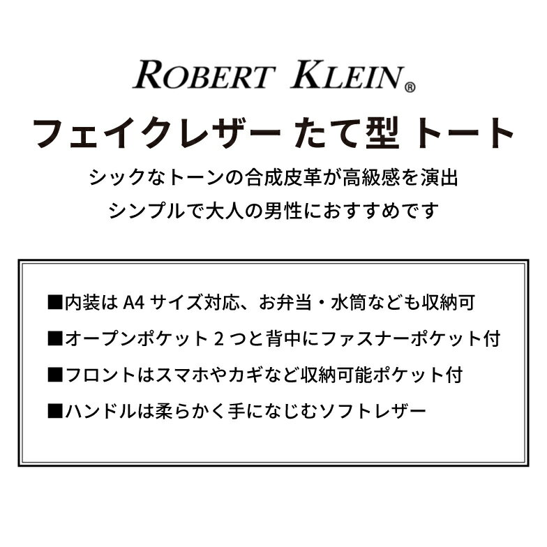 PRODUCT INFORMATION 【Robert Klein フェイクレザー 縦型 トートバッグ 8705】 ■サイズ:約タテ36cmxヨコ34cmxマチ13cm ■重 量: 約650g ■素 材:フェイクレザー ■カラー:ブラック/キャメル/ネイビー ■仕 様: ・留め具の種類: マグネット ・ポケットの数:4(外側1/内側3) ・ビジネスや普段使い等に使える合皮トート ・内装はお弁当や水筒、衣類等も収納可 ・オープンポケット2つ,ファスナーポケット付 ・フロントはマルチポケット付 ・持ち手は柔らかく手になじむソフトレザー ■生産国:中国 【その他商品キーワード】 ■用 途:ビジネス オフィス 普段使い 日常使い 通勤 通学 営業 クラブ 習い事 お稽古 旅行 国内旅行 新婚旅行 宿泊 帰省 里帰り お泊り イベント 街歩き 散歩 お出かけ用 ショッピング 🎁プレゼントとして[誕生日 バースデー クリスマス Xmas 昇進祝い 就職祝い 還暦 記念日 バレンタイン ホワイトデー 敬老の日 父の日 母の日] ■対 象:メンズ 男性 紳士用 お父さん パパ おじいちゃん 男の子 男子 レディース 女性 婦人用 お母さん ママ 主婦 おばあちゃん 女の子 女子 ビジネスマン OL 大人 社会人 学生 大学生 ■イメージ他:おしゃれ かっこいい クール 渋い 落ち着いた しっかりした 男女兼用 ユニセックス 大容量 大きい 軽い シンプル お手頃 安い 高品質 使いやすい 丈夫 便利 ビジネス カジュアル 定番 人気 売れ筋 おすすめ ご注意 ※記載しておりますサイズ・重量は測定方法により若干異なる場合があります。
